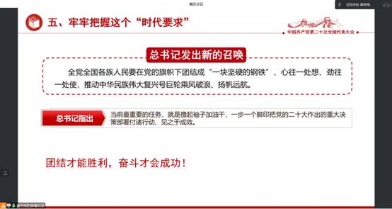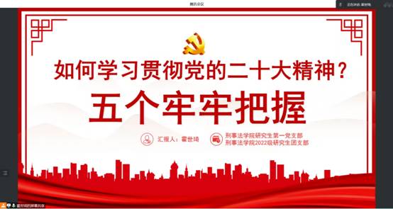 中国共产党第二十次全国代表大会是在全党全国各族人民迈上全面建设社会主义现代化国家新征程、向第二个百年奋斗目标进军的关键时刻召开的一次十分重要的大会。2022年11月4日上午,为深入学习领悟党的二十大精神,团结凝聚青春奋斗力量,best365中国官方网站研究生第一党支部、best365中国官方网站2022级研究生团支部联合举行党的二十大精神专题学习会议。会议由支部书记霍世琦主持。