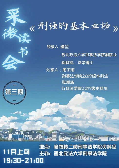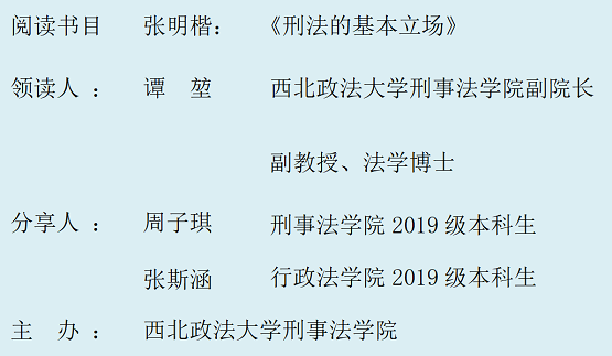 1、请有意参加读书会的同学先自行阅读指定书目,图书版本:张明楷:《刑法的基本立场》,商务印书馆2019年版;