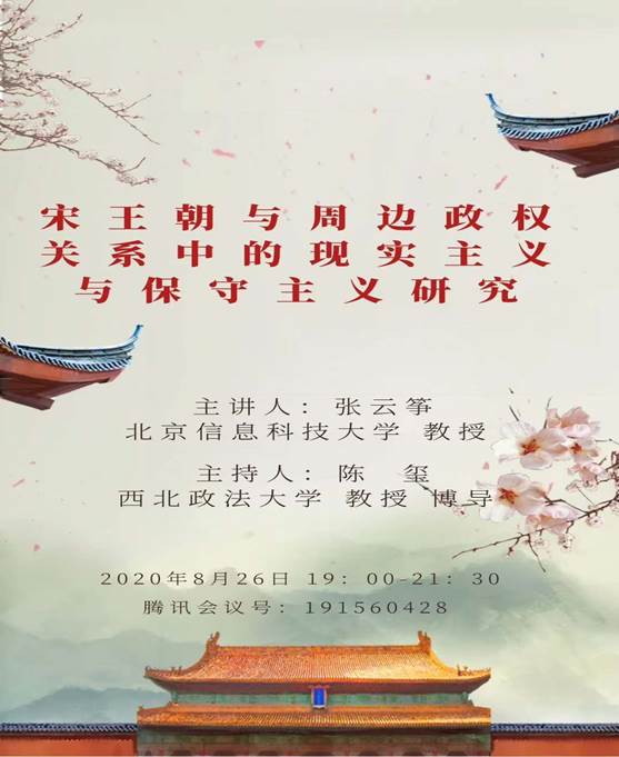 2020年8月26日19点,讲座“宋王朝与周边政权关系中的现实主义与保守主义研究”在腾讯会议准时召开。本次讲座由best365中国官网司法惯例与诉讼法治现代化研究青年学术团队主办,北京信息科技大学教授,博士生导师张云筝主讲,best365中国官网教授、博士生导师陈玺主持。
