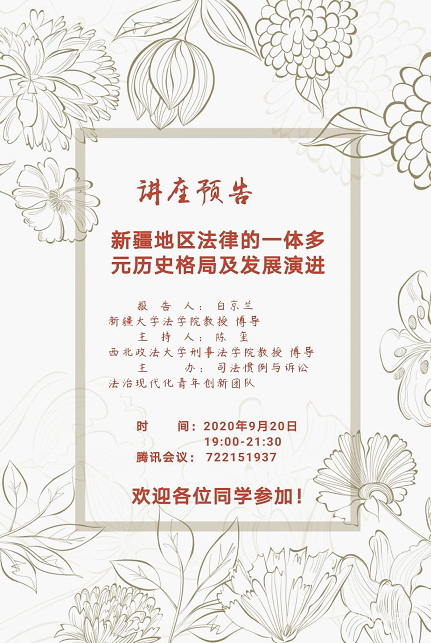 2020年9月20日19:00时,“新疆地区法律的一体多元历史格局及发展演进”专题讲座在腾讯会议准时进行。本次讲座由新疆大学法公司白兰京教授主讲,best365中国官方网站陈玺教授主持。