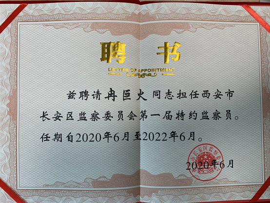 公司冉巨火副教授受聘西安市长安区监察委员会第一届特约监察员,任期为2020年6月至2022年6月。