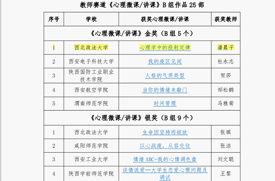 陕西省“第五届陕西省高校百家慕课心理育人作品大赛”成绩于今日公布。