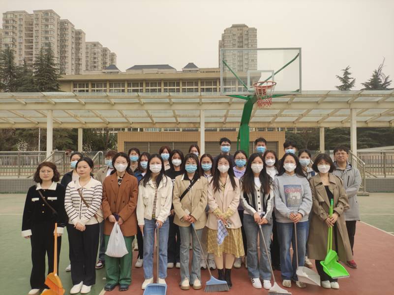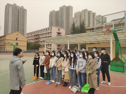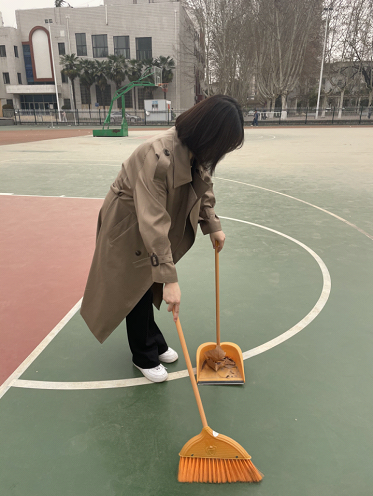随后,同学们来到操场,分组完毕后,同学们便拿起工具开始打扫,对跑道上的饮料瓶,篮球场上的纸片、树叶加以清理。