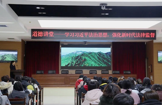 活动伊始,同学们参加了由长安区检察院组织的道德讲座,讲座的主题为“学习习近平法治思想,强化新时代法律监督”,共分为四个环节。第一环节为自我省心,主持人引导在场人员闭眼遐想,静心思考自己该如何正确行使好权力。第二环节为演唱道德歌曲,一首公民道德歌叩响了同学们的心弦。第三个环节为讲述道德故事,由第一检察部与第二检察部代表为同学们讲述“不忘初心,方得始终”的道德故事,教导同学们今后无论从事什么工作,都要不忘初心,牢记使命。最后一环节为畅谈道德感悟,由长安区人民检察院副检察长为同学们介绍了司法改革后检察院的部分现状,并为同学们答疑解惑。