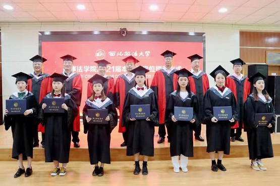 随后来到全场最激动人心的时刻,冯卫国、毕成、杜发全、张国伟、刘辉、唐昕、谭堃7位硕士生导师依次为公司2021届本科毕业生拨穗并颁发学士学位证书。老师们的目光满含期许,向同学们送上最真诚的祝福,完成授予仪式的同学脸上洋溢着灿烂的笑容和对未来的憧憬。