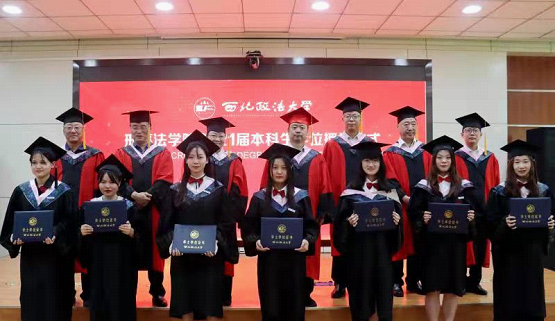 毕成、张国伟、刘辉、冯卫国、杜发全、唐昕、谭堃(左后一开始)硕士生导师为毕业生拨穗并颁发学士学位证书