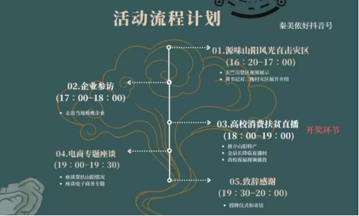 直播中,主持人首先就活动背景进行了简单介绍,而后连线山阳县三槐村黄书记了解当地受灾状况。山阳县安置和重建工作正在有序开展,黄书记就秦美侬好团队对三槐村的定点捐赠表示了感谢,并向团队赠送了书籍,以表达对同学们的鼓励。记者带领团队成员实地参访陕西家金商贸责任有限公司核桃生产前线,并在企业成品展厅试吃核桃仁、核桃乳等特色产品。在山阳特产馆中,主播从讲述商洛核桃的种植历史说起,向观众推介当地特色核桃加工产品。