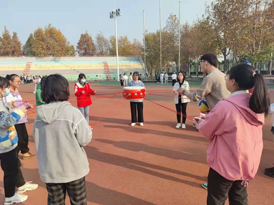 活动主要由各班心理委员和班长负责前期策划和具体实施,同学们集思广益、建言献策,积极参与。2021级1班和2班的同学相聚田径场,进行了“绑腿跑”、“背夹球竞速”、“鼓颠球”等项目,陌生和隔阂在他们一起商量对策,一起应对挑战时逐渐消解。3班的同学分小组团队合作了开展了“六人七足”、“踢毽子”、“运乒乓球接力赛”等游戏。他们在合作中求进步,在团结中相熟识。4班同学的“贴面”和“击鼓传花”游戏带来了小小的刺激 ,“歌词接龙”拉进了彼此间的距离,活动中欢声笑语不断。5班素质拓展活动由“守护天使”开启,还举行了“戏精的修养”和“老狼老狼几点了”两个游戏,大家的手握在一起,把同学们自初见相识那一刻就注定的友谊牢牢握住。