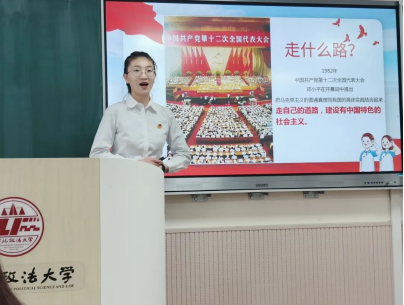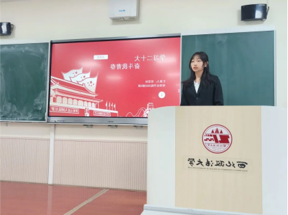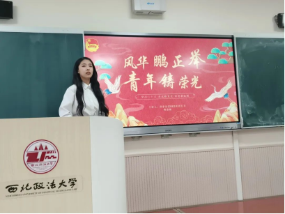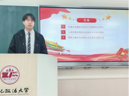 2021级徐浩同学以《争当中国式法治现代化践行者》为主题讲授团课。他从三个方面进行了具体阐述,注重与实际相结合,联系公司师生在国家法治建设过程中的具体事例阐述了法治精神,向西法大学子发出以我所长服务社会的号召。