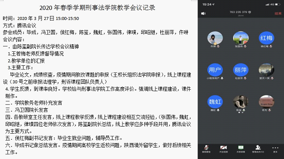 各教研室主任在会上分别发言,反馈了各教研室教师的线上教学情况。在这几周的线上教学中,为保证教学的有效性,采取各种平台并用的方法,提高员工兴趣,并就线上课程建设交流经验。法理教研室与刑诉教研室表示将尽快开启在线课程建设的准备工作并借鉴已有课程的经验。